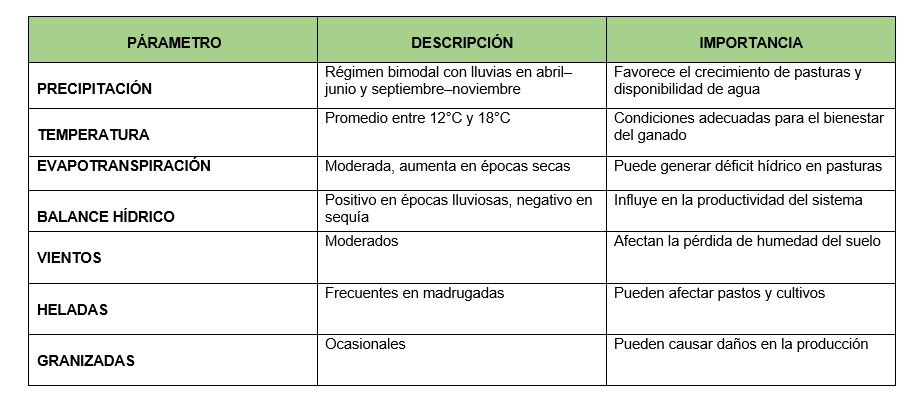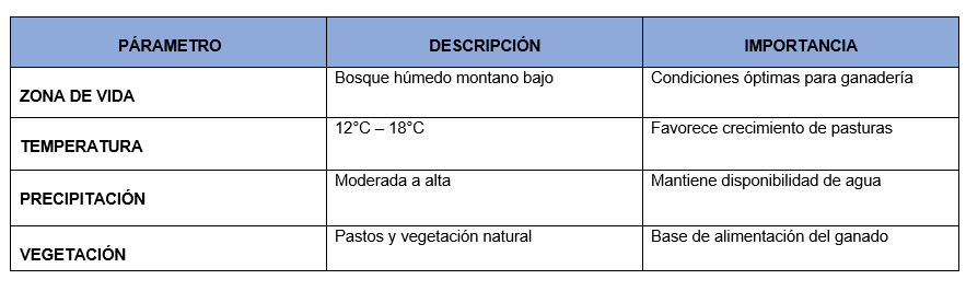 El análisis de los componentes biofísicos del predio permite comprender las condiciones naturales que influyen en el desarrollo del sistema productivo ganadero. Factores como el clima, la disponibilidad hídrica, la zona de vida y las características geológicas determinan la capacidad del suelo, el crecimiento de las pasturas y el bienestar del ganado. En este sentido, la integración de estos elementos es fundamental para evaluar la sostenibilidad y productividad de la finca.